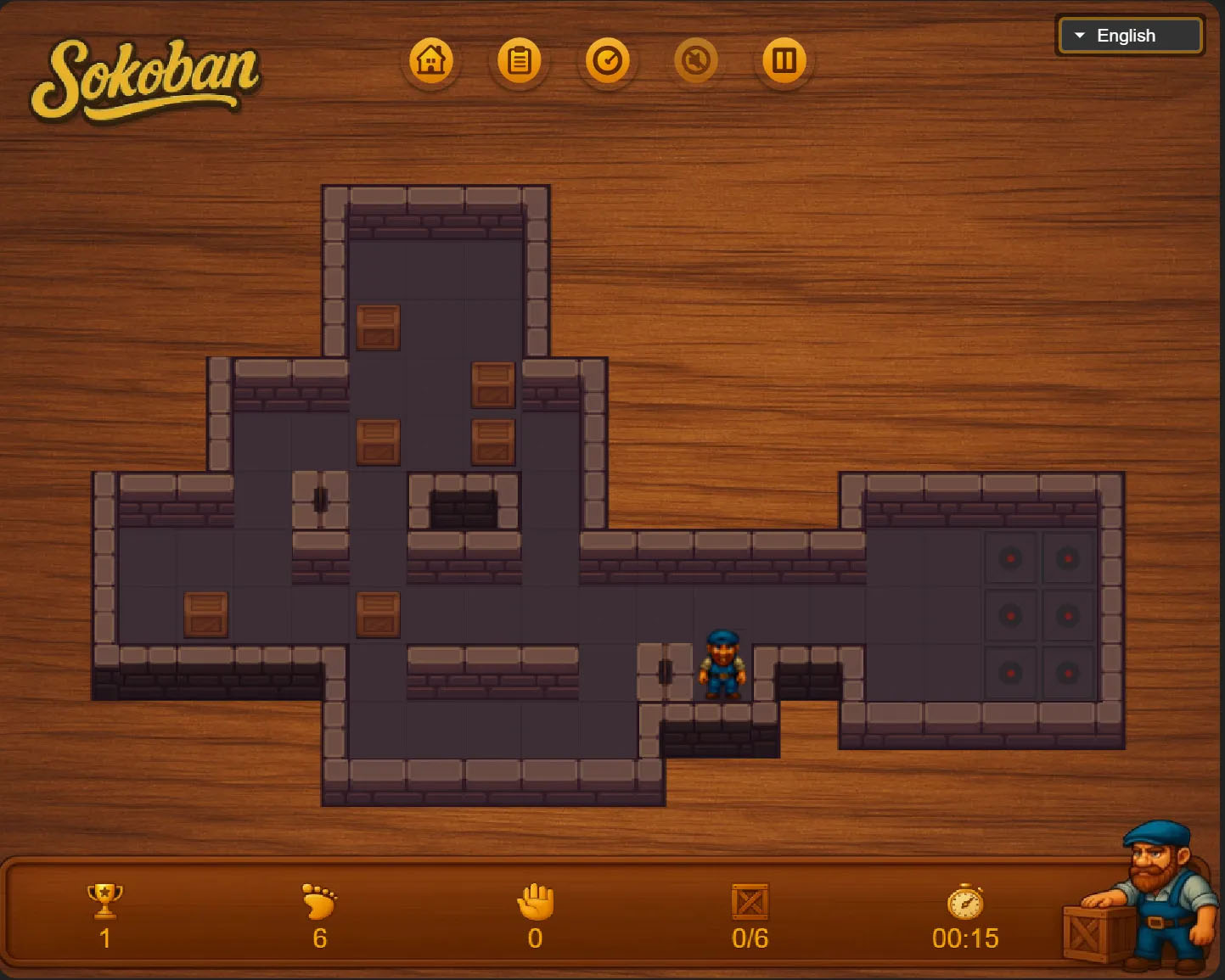 - Score tracking - Time, moves, and pushes are tracked for each level